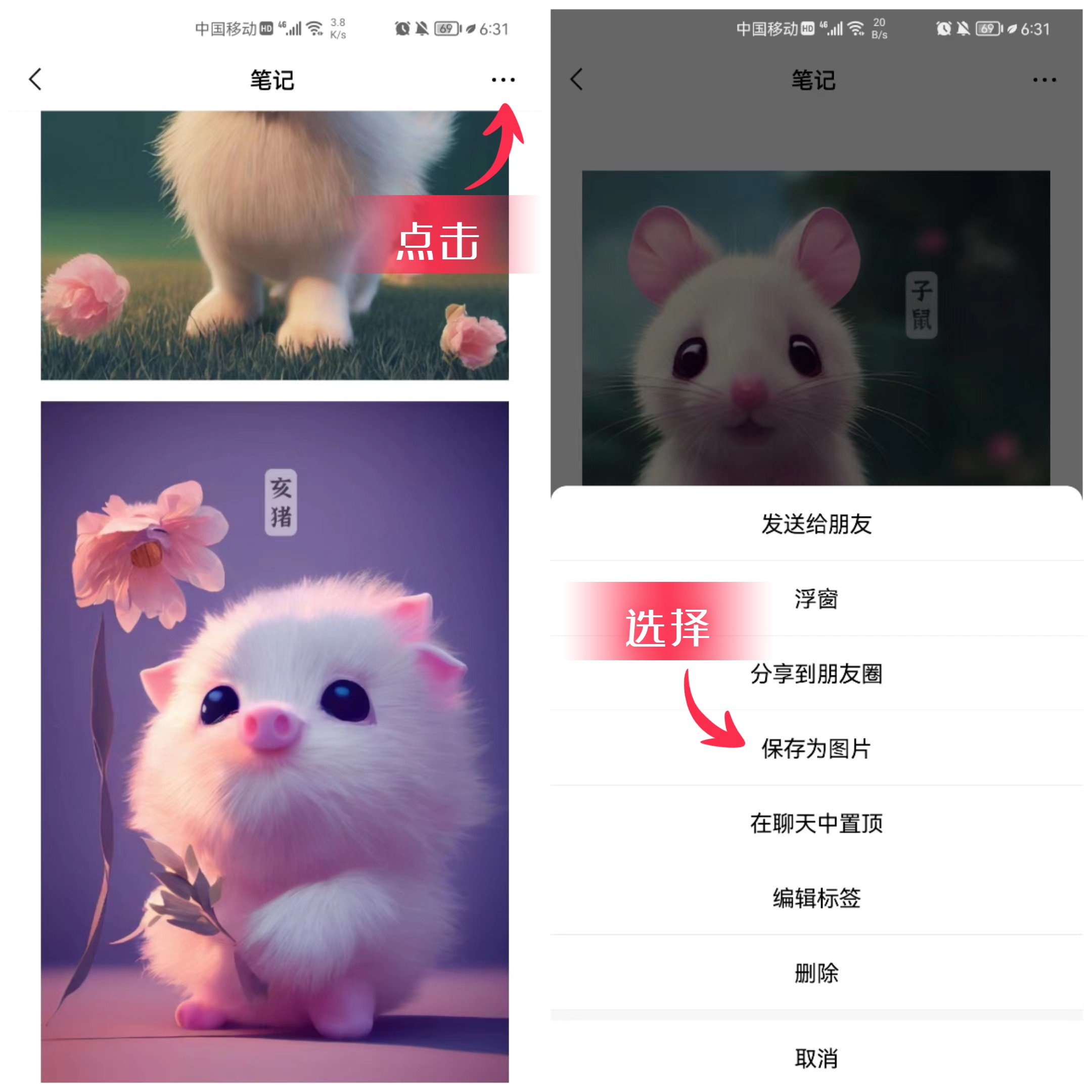 ④随后图片就添加到笔记中了,它会按照你勾选的顺序,进行纵向排列。接下来点击右上角的“···”,选择【保存为图片】,照片就自动拼接成长图了。