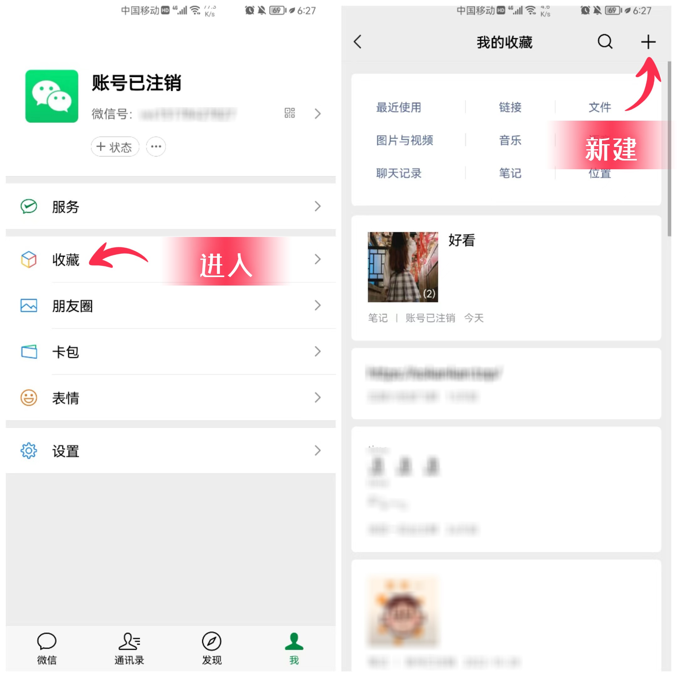 ①打开微信首页,点击右下角的【我】,进入【收藏】功能,这里面保存着各类文件,相当于一个云盘,然后点击右上角的“+”号,新建一个空白笔记。