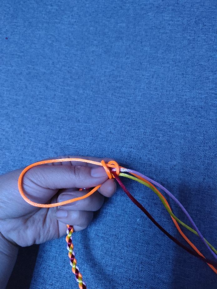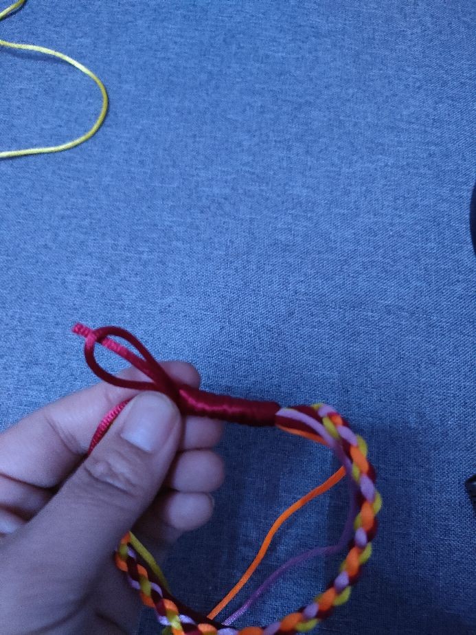 第四步:待编到合适的长度,随便挑一根线打结,如图。