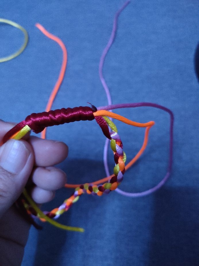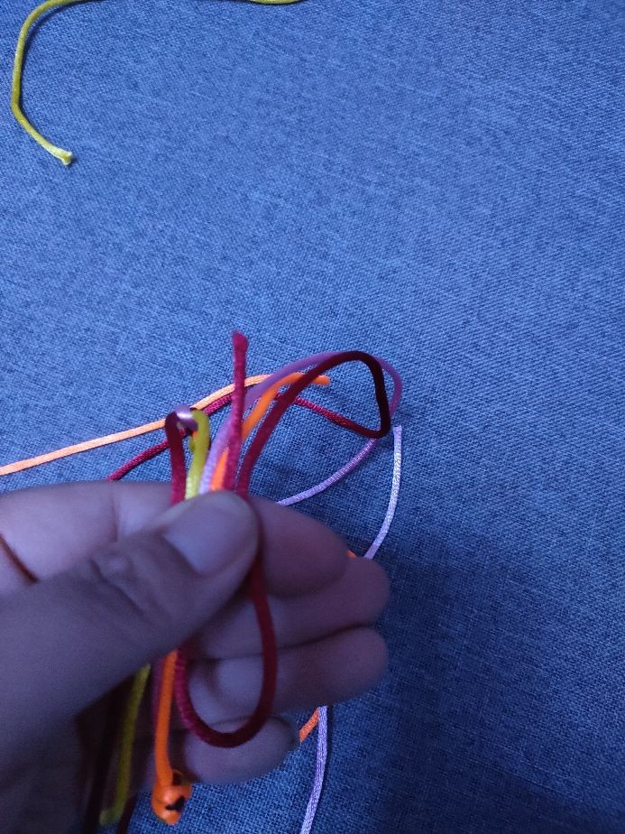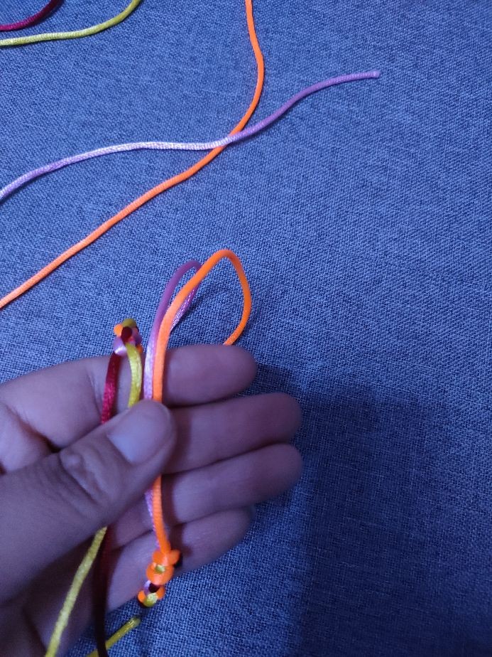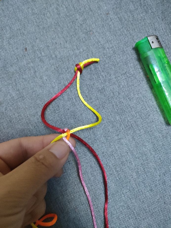 第一步:找四根不同颜色的线,将红黄两根随便打结,粉橙两根线用火机燃烧一点点后立马对齐粘在一起。