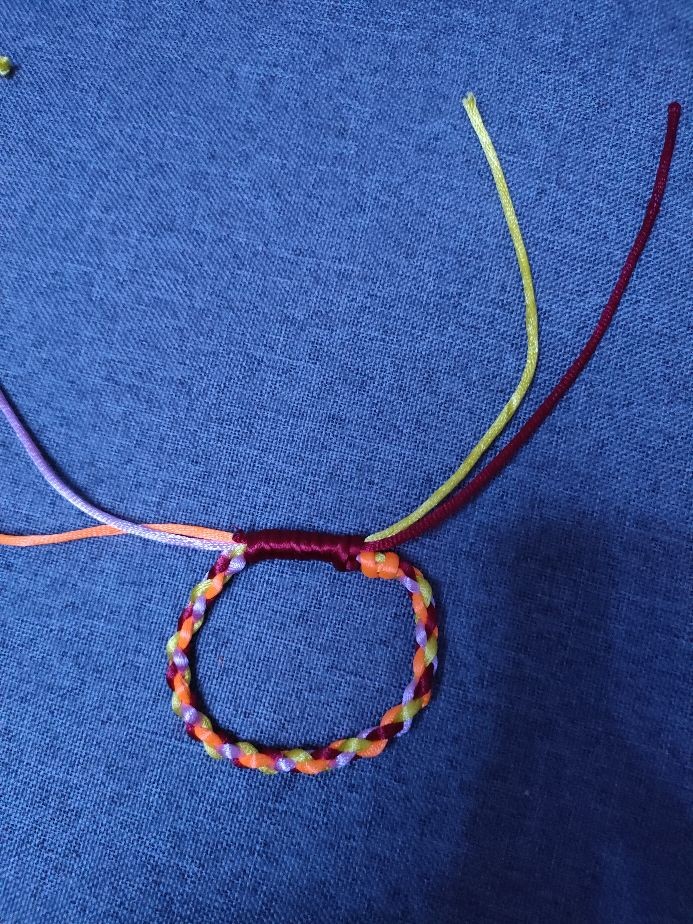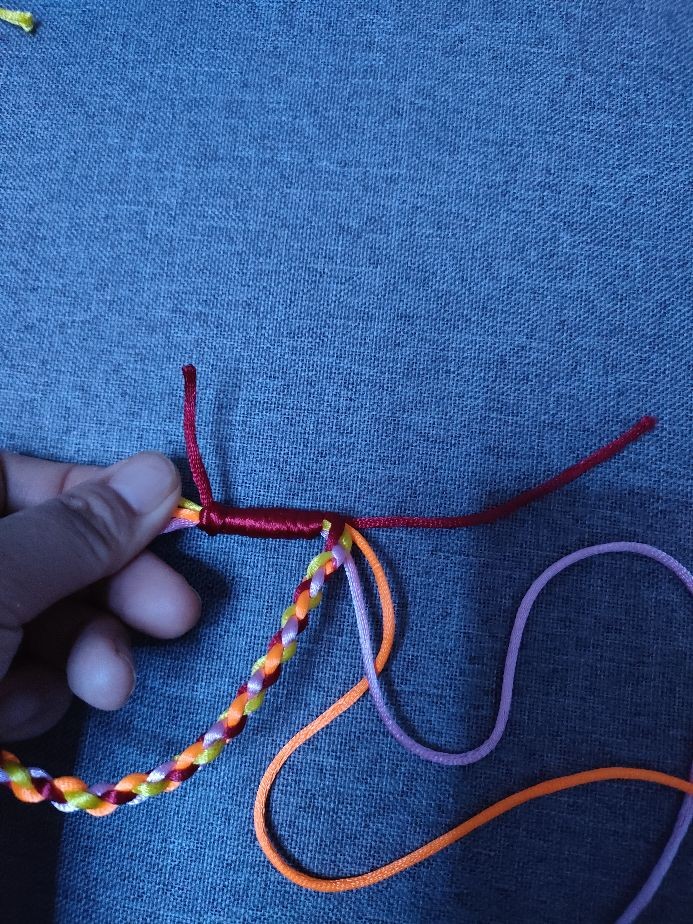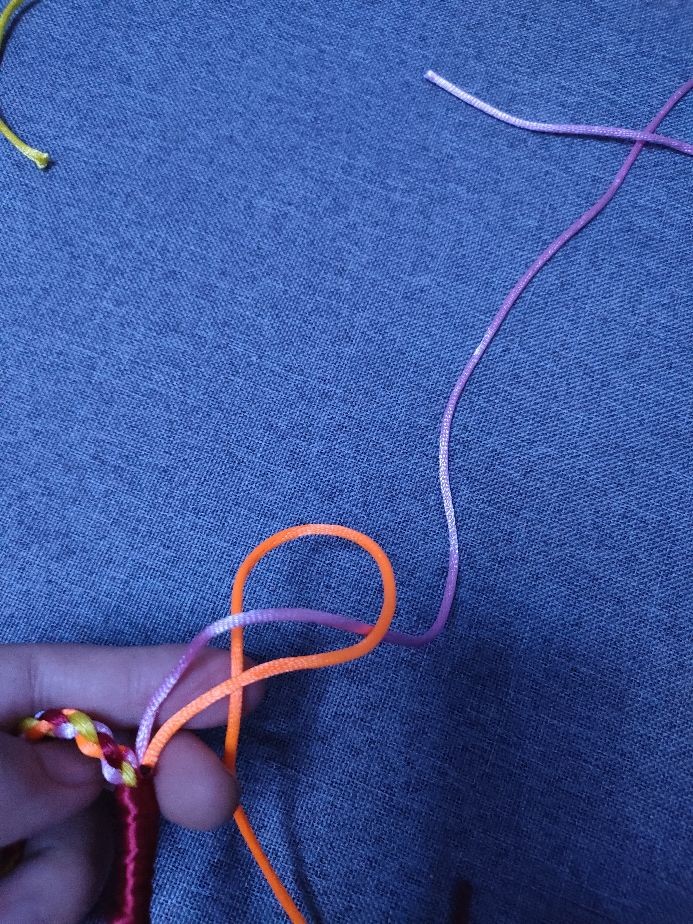 第三步:将红黄两根线自上而下压住粉橙两根线形成交叉,再将粉橙两根线自上而下压住红黄两根线形成交叉,依次类推。