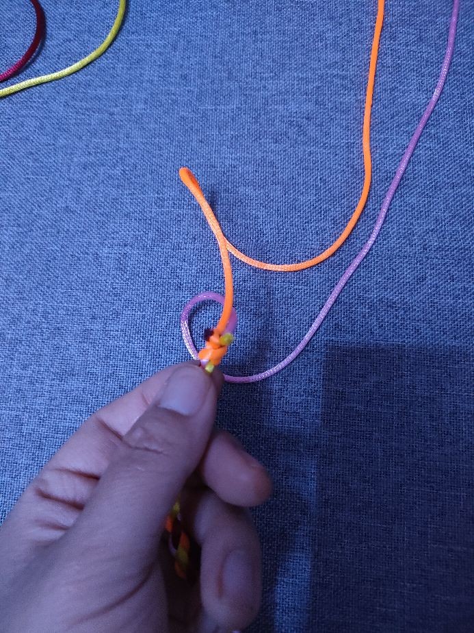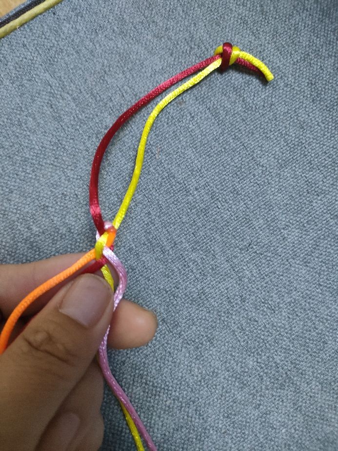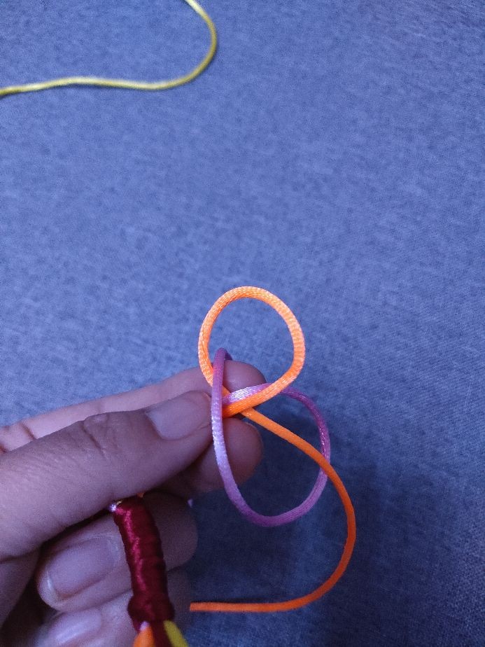 第二步:将红黄两根线上下交叉,再将粉线钻入红黄两根线组成的圈内,自上而下分别压住红黄两根线同橙线形成上下交叉,四根线交叉在一起,如图。