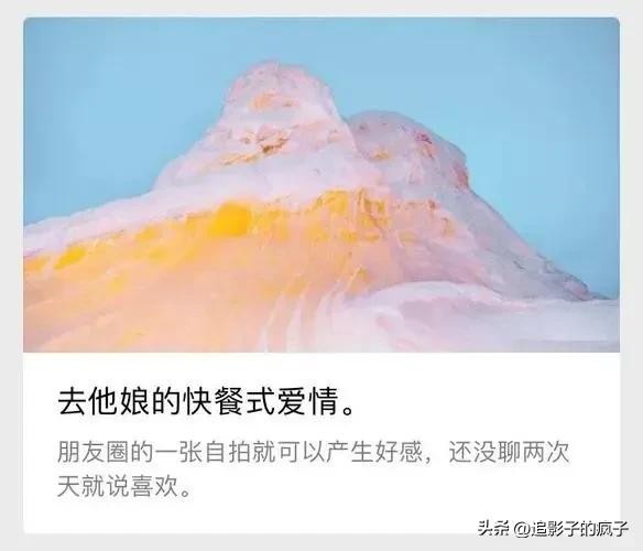 在当今社会下,越来越多的人“追求”快餐式恋爱,因为相比于以前的旧社会,现在的恋爱成本下降,以前车马很慢,一生只能爱一人;而现在的社交软件的发达×交通工具的便利使得现在的人们可以在一天内完成很多事情,现在的一天走完了以前的一生。看到一张好看的照片,听到一段好听的语音,甚至一句普通的“晚安”……就说喜欢,就开始展开一段追求,三天之后表白,答应就在一起几个月甚至几个星期,不喜欢了腻了就分开再找下一个;表白后拒绝了就开始寻找下一个目标,丝毫没有感到伤心难过,因为这对他们来说谁都一样,都是“一顿快餐”罢了。所以说现在的爱情也越来越不纯粹了,好像所有的人都是奔着目的来谈恋爱的,而真爱更是越来越少。