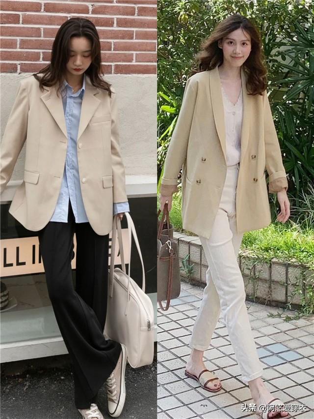 同时这种杏色的西装也会比你想象中更百搭,可能常规的黑白色西装很百搭,但穿久了会撞衫,这种杏色的西装搭配起来会很轻松,里面无论是配衬衫还是T恤都可以,选择浅色的内搭也能形成轻盈感。