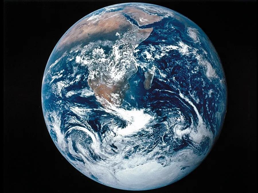 1972 年,阿波罗 17 号航天器上的宇航员在航天器前往月球时捕捉到了令人惊叹的地球图像。广阔的海洋环绕着非洲大陆、马达加斯加岛和阿拉伯半岛。大气中的云层和南极冰盖也可见。