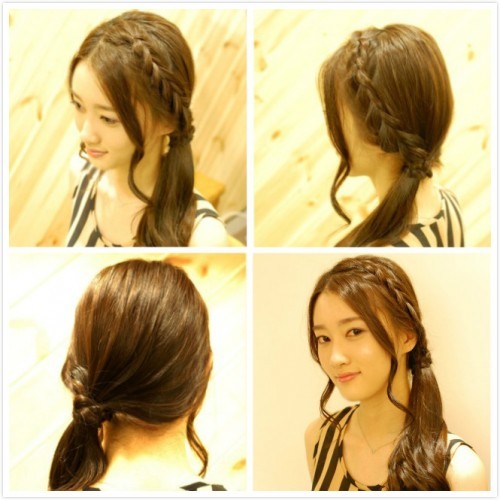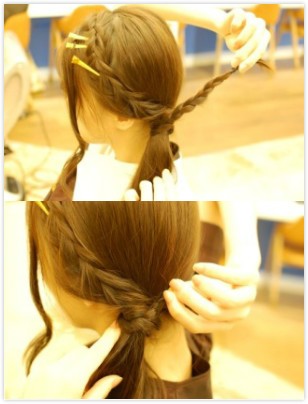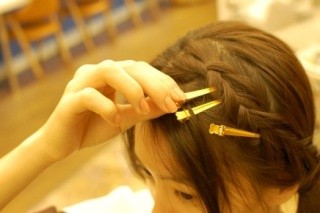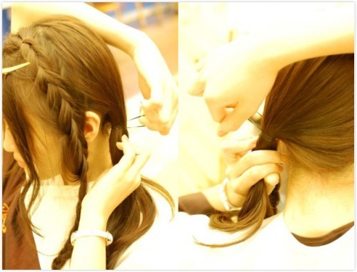 6. 用几个小夹子把刚才编好的部分和下面的头发夹在一起固定。