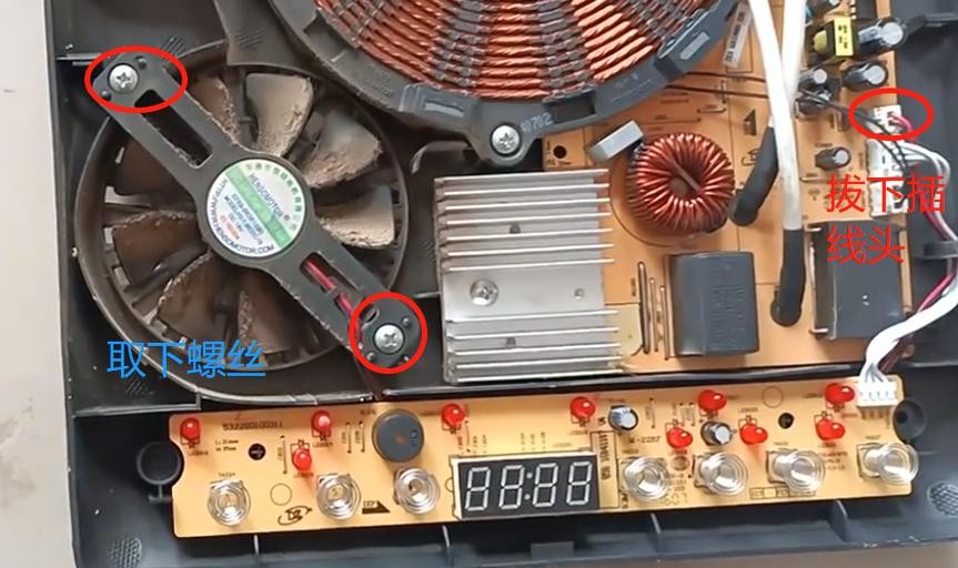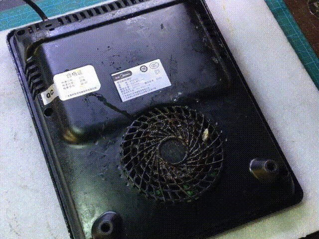 检测方法:拆下电磁炉后盖的四颗固定螺丝,将后盖拆开。通电,按开关键,观察一下散热风扇是否旋转,如果不转说明散热风扇损坏