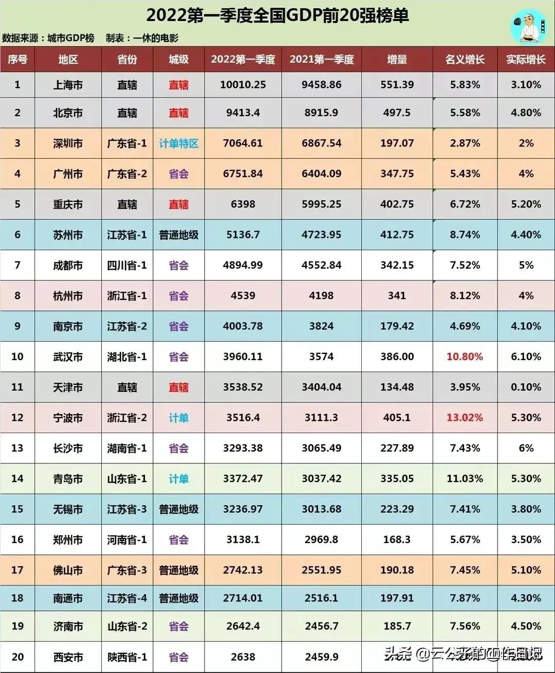 看一组数据,2022年第一季度GDP排名,重庆领先成都将近500亿,增速也是高于成都的。