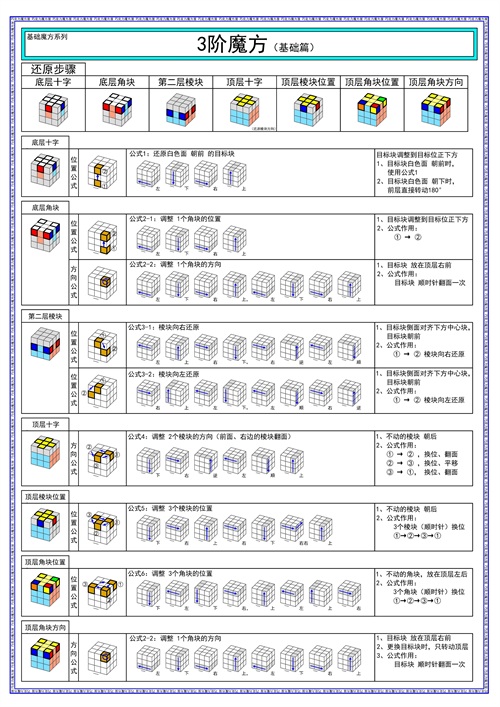 这个还原顺序也是最常见的,主要用于三阶魔方,并不适用大部分的异形魔方。但,里面的公式口诀,对于还原更多不同的魔方有很大的帮助。建议学习。