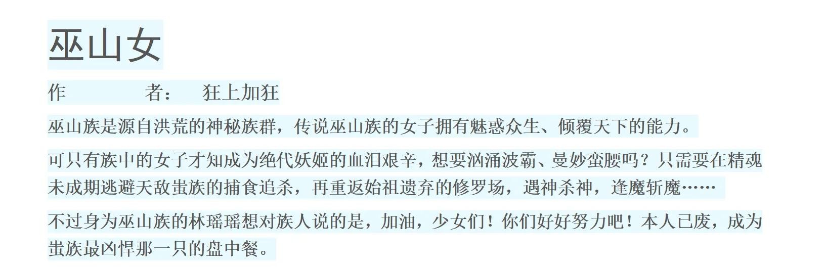 哈哈哈!好久没有给大家推荐小说啦,今天想给大家推荐一部狂上加狂狂的,非常好看的!本人非常喜欢的一部小说,它就是《巫山女》!!!刚开始看的时候,看到巫山族,蚩族,一听这名字就觉得非常的神秘,这是一部现代奇幻加前世今生文哦!!!非常有创意啦!!!文中设定的巫山族是女人族,就是说这个族里面全是女人,蚩族是男人族,族里面全是男人,巫山族跟蚩族自古以来就是两大对立家族!!!男主跟女主就是在这样的背景下 通过发生一系列的事情最在一起!!!想想就非常的有看头,刚开始我就是抱着这样的心态去看这部小说的,结果越看越有味道,越看越让我欣喜!!!怎么说呢?这是我不曾了的世界!!!真的是打开了我的眼界!!!哈哈哈真的是非常的好看!!!加上作者的文笔非常的好!!!有保证!!!情感线也非常的流畅!!!大家不要错过呀,我把简介放到下图了!!!