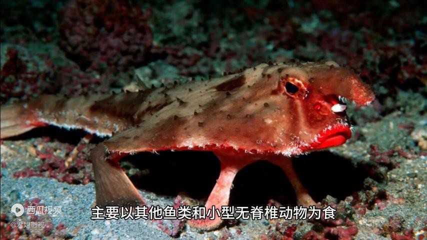 你见过四条腿的红唇蝙蝠鱼吗?这是一种非常奇特的生物,它有四条腿还有一张红唇般的大嘴。红唇蝙蝠鱼生活在深海中,它们身体扁平,身体颜色鲜艳,通常为红色或橙色,嘴巴周围还有一对红色的鳍,非常引人注目。它们是一种肉食性鱼类,主要以其他鱼类和小型无脊椎动物为食。