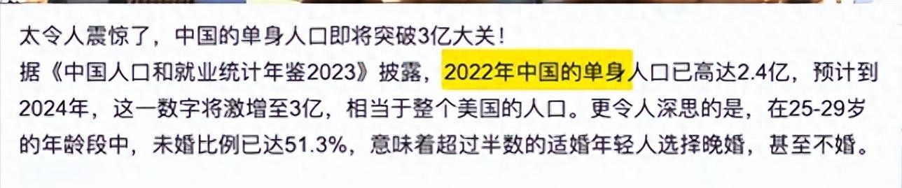 中国单身人口的规模已达到令人瞩目的程度,截止 2022 年超过 2.4 亿,预计 2024 年将逼近 3 亿,这一数字与美国人口总数相当,在全球人口版图中占据着醒目的位置。深入到婚恋适龄群体内部,情况更为严峻,27 岁人群未婚概率约 52.4%,29 岁人群也有 34% 未婚,毕业短短数年,半数乃至三分之一的年轻人尚未步入婚姻殿堂。在城市的大街小巷、职场的忙碌身影中,单身者已成为一个庞大且不可忽视的群体。
