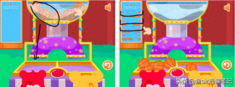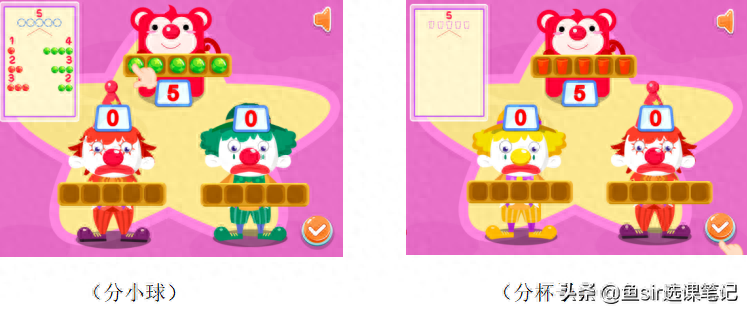 第2个游戏是方块猴在表演现场帮助小丑分小球,老师会先带孩子完成一遍,并总结数字变化规律,然后让孩子通过分杯子的游戏,在动手操作中巩固练习。