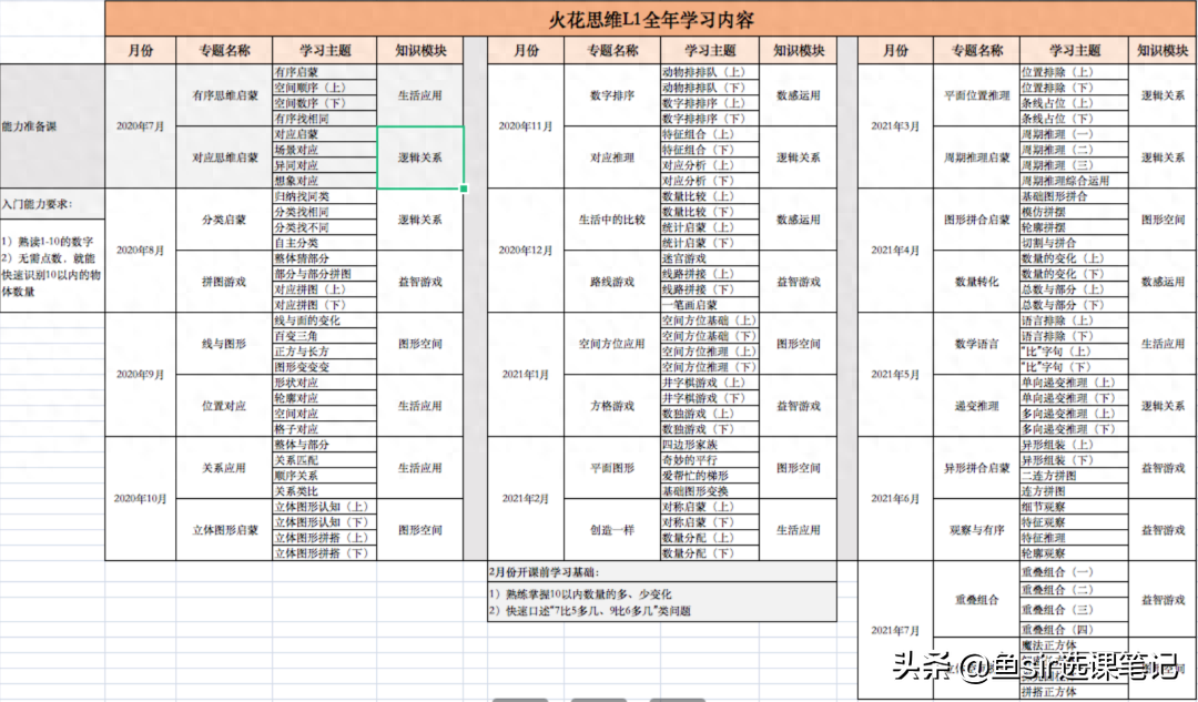 上面这张密密麻麻的表格,是鱼Sir整理的火花思维L1级别2020-2021学年的全年学习大纲。