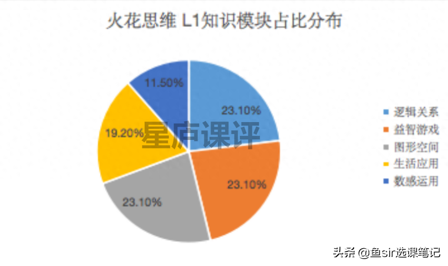 从统计图上来看,火花思维L1级别的课程共包含数感运用、逻辑关系、益智游戏、图形空间、生活应用五大部分,其中图形空间、益智游戏、逻辑关系占比均为23.10%,数感运用占比较少,仅为11.50%。