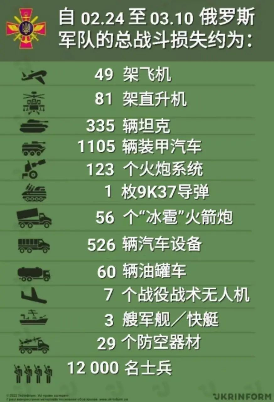 乌军总计摧毁了俄军130架飞机(其中49架固定翼战机和81架直升机),打掉335辆坦克和1105辆装甲车,526辆军用车辆,123门身管火炮,56辆多管火箭炮,29套野战防空系统,击落7架无人机,击沉击伤3艘军舰,击毙约12000名俄军。上述数字我们连标点符号也不信。