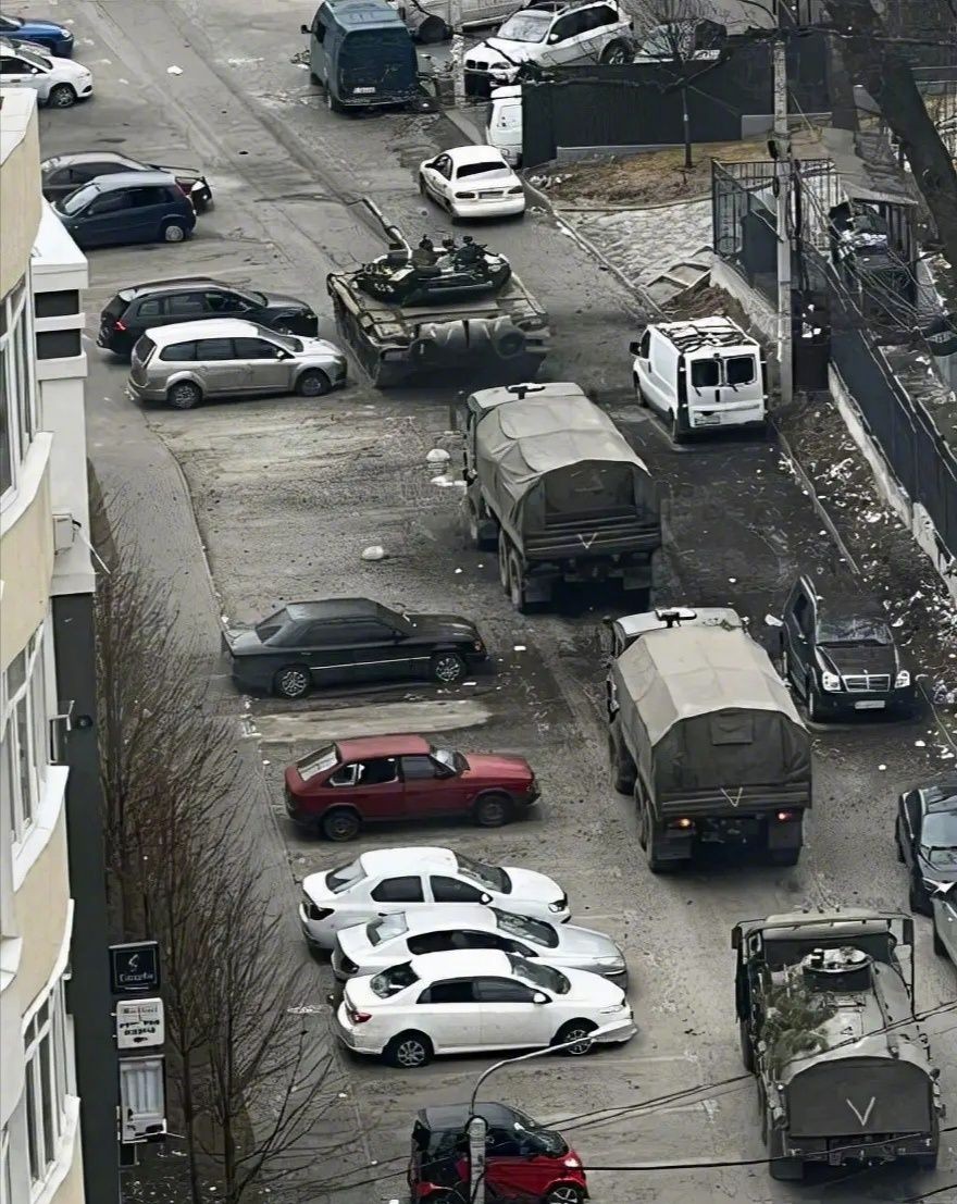 从路边停放的车辆看,这应该是基辅郊区的一个富人区,我看到好几辆奔驰和宝马汽车。俄军车身上的“V”字,表明他们是从白俄罗斯方向南下直插乌克兰基辅的俄军北部集群。