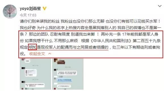 刘雨欣接着发微博说自己在2017年前是军人身份,而按《刑法》规定,明知是现役军人的配偶而与之同居或结婚,要处三年以下有期徒刑或者拘役,如果她真的想针对张檬,根本就不用那么麻烦。一开始刘雨欣还只是因为工作的原因撕张檬,现在就直指张檬插足了她的婚姻。