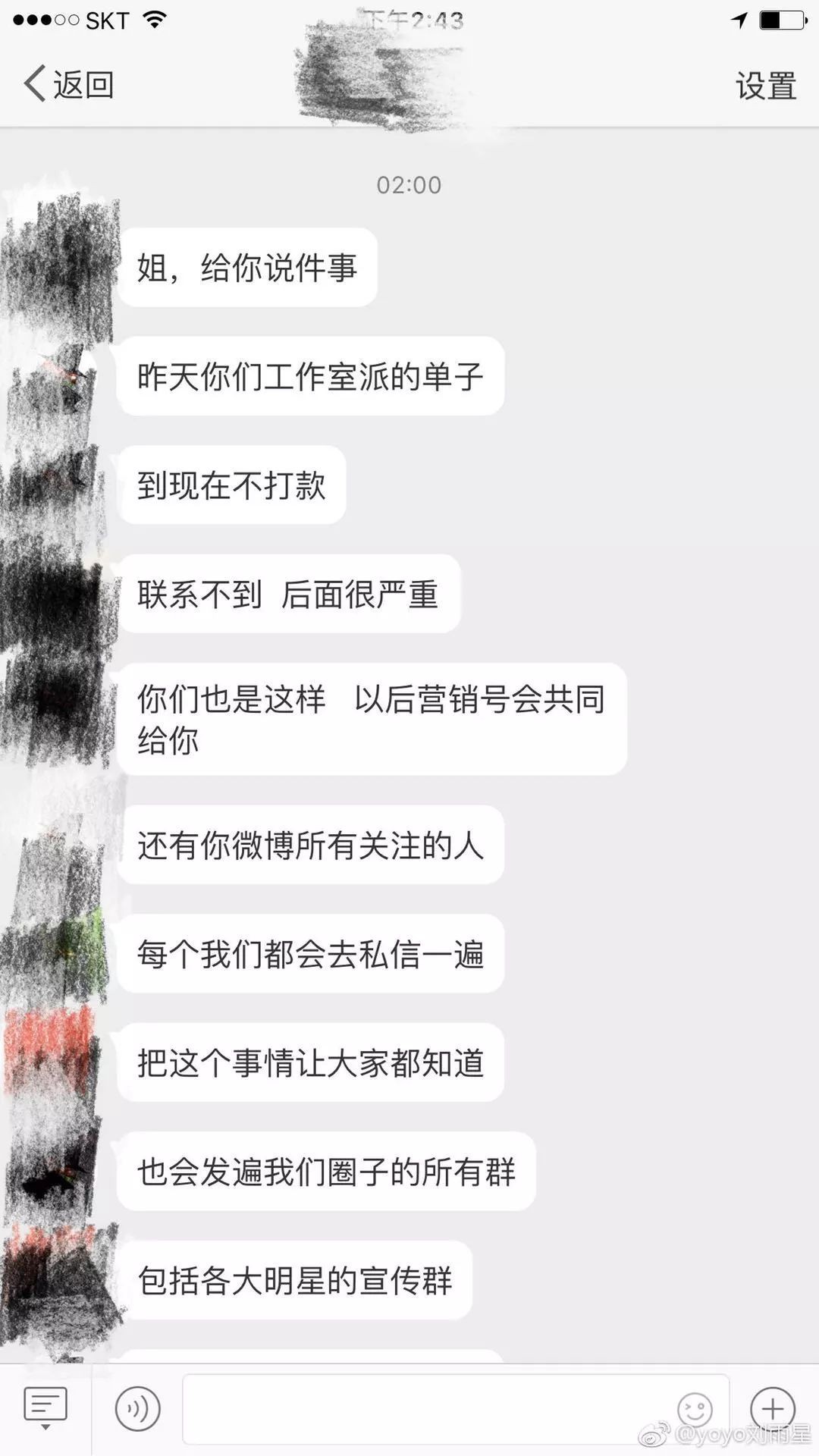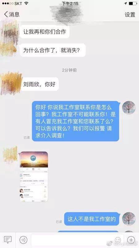 根据刘雨欣晒的图,有人假冒她的工作室和圈内人士联络,下单但是不给钱,目的就是为了搞臭刘雨欣,而这个假冒刘雨欣工作室的人就是张檬团队的。