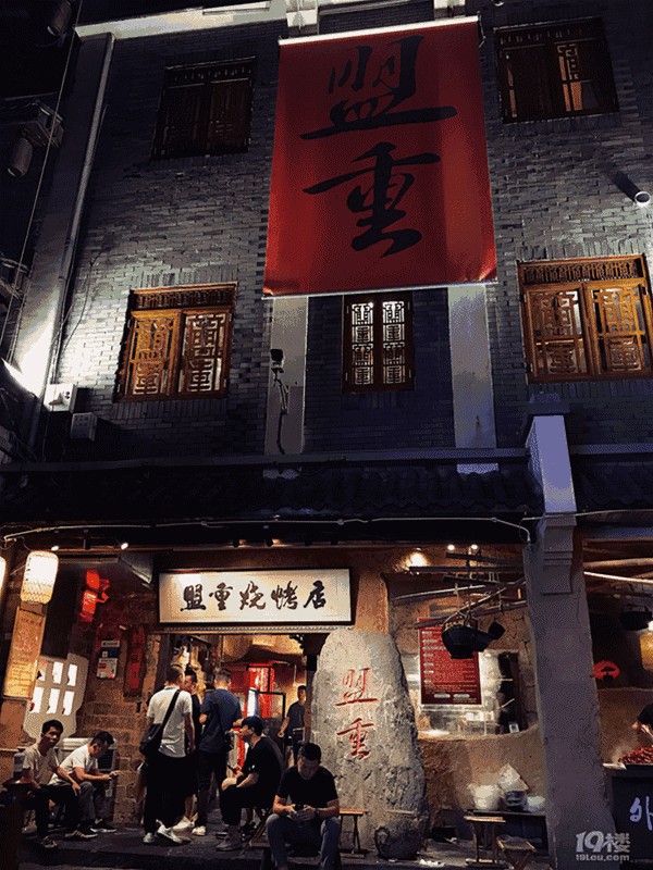 从一条颇有古风的街巷走到底,就是盟重烧烤了,有种烧烤大本营的感觉,门口的大石头上写着“盟重”,旁边有做小龙虾的档口,再就是门口坐在小马扎上排队的人了。
