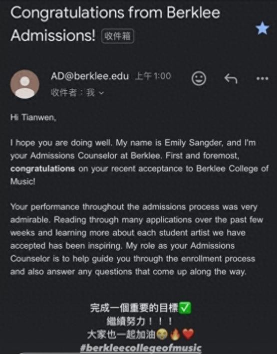 这一切源于一封来自国际知名音乐学府BerkleeCollegeofMusic的录取通知书,寄给了这位少女。当这则消息在社交平台上曝光后,网友们瞬间沸腾了!不少人感慨这是一个重要的里程碑,更有不少粉丝纷纷表示祝贺和期待,毕竟这标志着这位年轻的音乐才华即将展开全新的旅程。