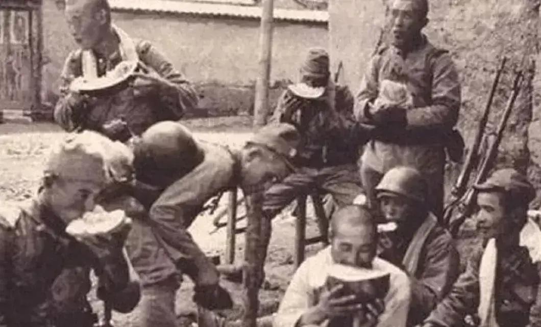 一群侵华日军,作恶作累了,正在休息并且手里拿着西瓜吃。