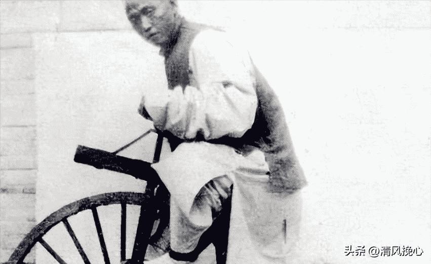 这名男子正在骑的就是一辆木质自行车,当时的自行车与现在的区别很大