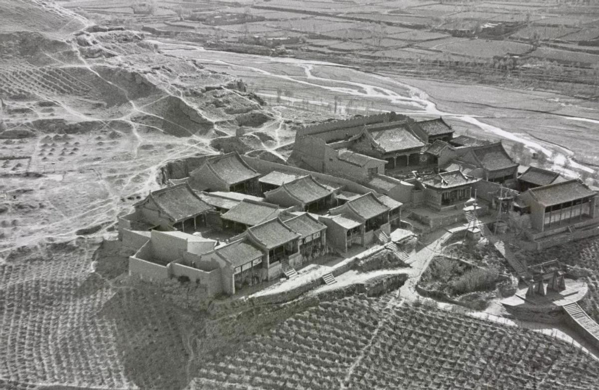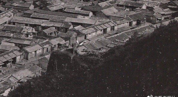 左图,高清鸟瞰南口古镇老照片。中图,左图的截图:古镇东侧的明朝太监李公墓。右图,也是左图的截图。曾经繁荣的街巷。