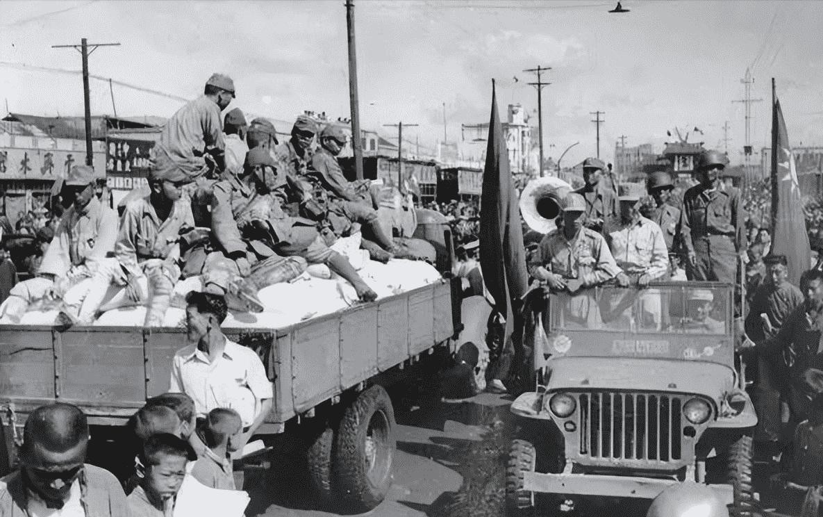 这张照片里,一边是中国军队开进南京,另一边是落败的日军散坐在一辆卡车上。