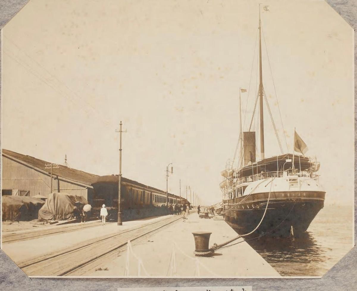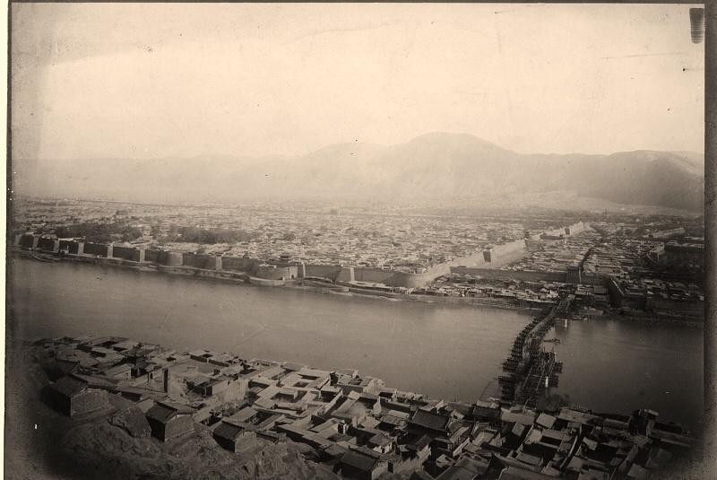 鸟瞰1907年开工,1908年正在修建中的兰州铁桥。图1是图2的截图,从白塔山上鸟瞰正在施工的兰州铁桥。图3是图4的截图。从白塔山西侧鸟瞰兰州铁桥。从两张截图可以看到这样的细节:建于明洪武年间的浮桥还在使用,而兰州铁桥已经开建。这是历史的记录。照片的作者是生于太原的英国传教士的儿子,博物馆学