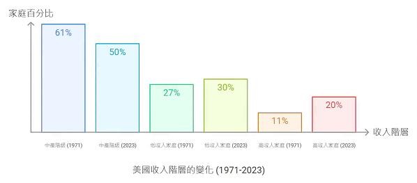 百货公司传统上依赖中产阶级作为主要消费群体。然而,美国中产阶级的比例正不断下降。1971年,超过60%的美国人属于中产阶级,但到2023年,这一比例已跌破50%。与此同时,高收入群体增加,更多消费者转向奢侈品牌,而低收入群体则更倾向于折扣零售商。这使得百货公司陷入尴尬的境地——既无法吸引高端消费人群,也难以在价格竞争中胜出。