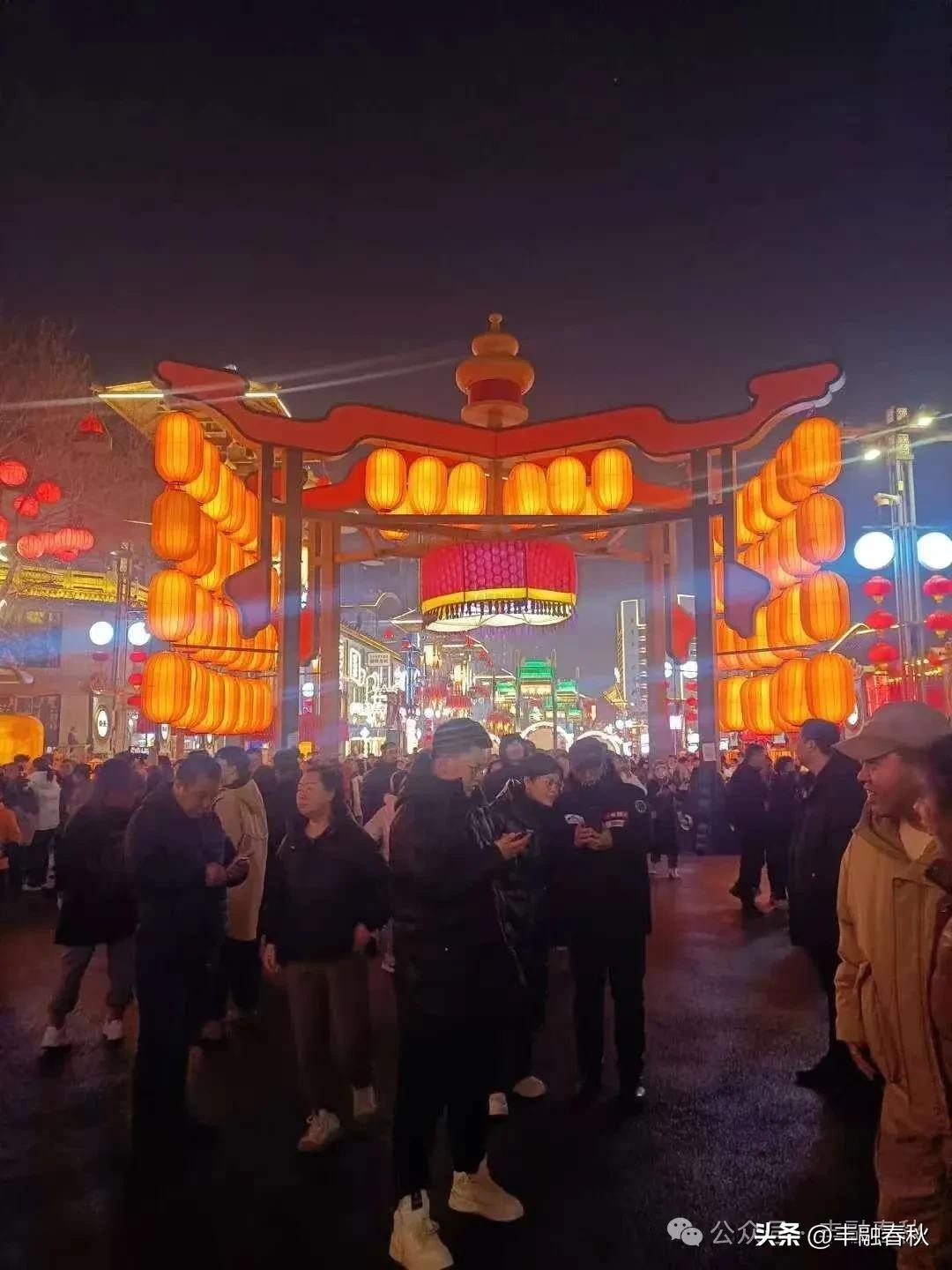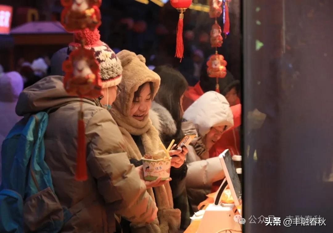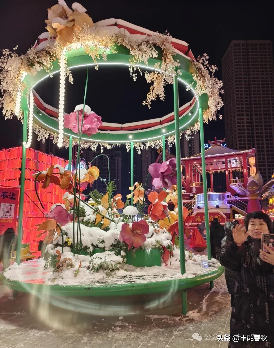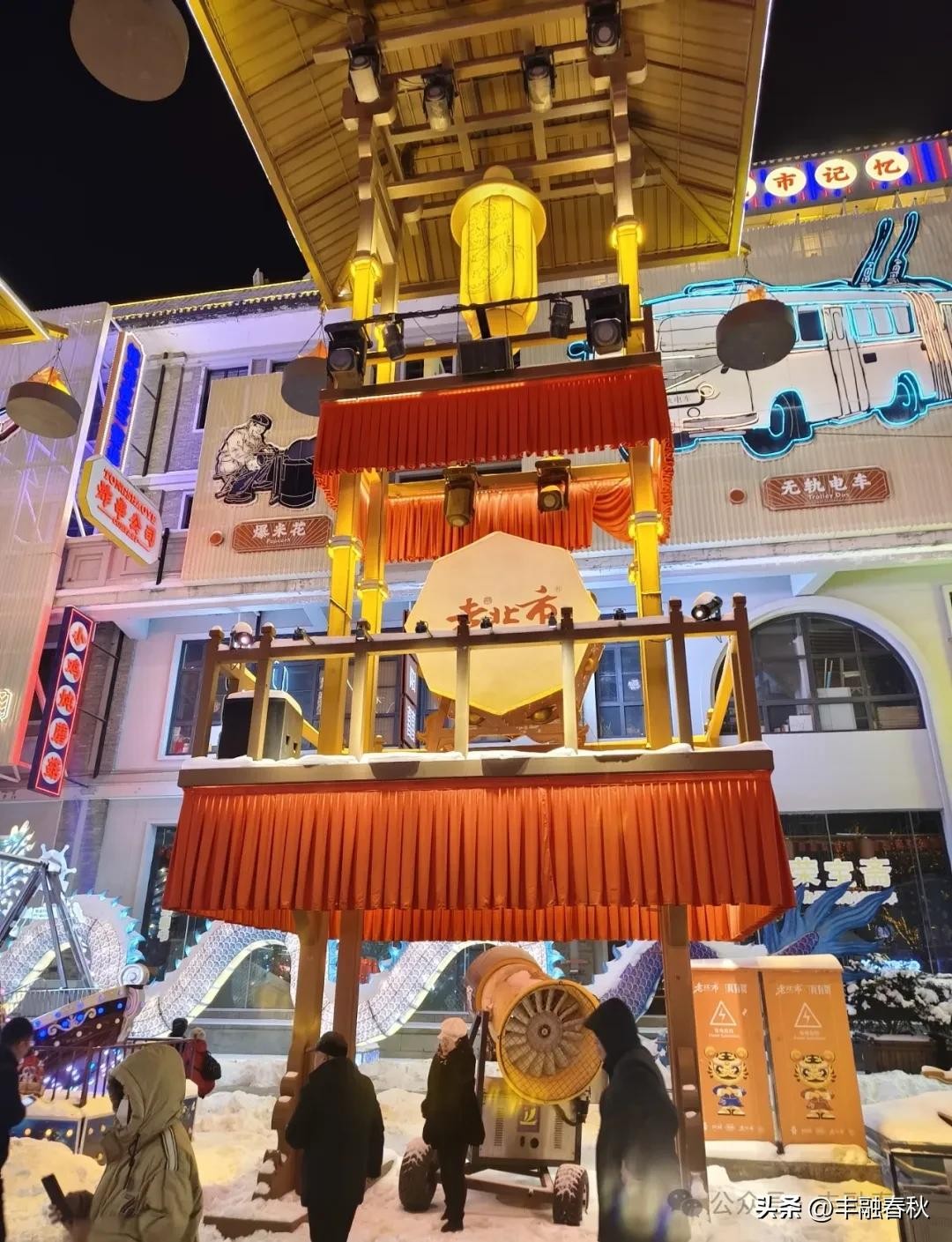 我们好不容易挤进院内,被眼前的一幕所惊呆。游人们不顾零下近30度的寒潮,挤满了各个摊位和档口,特别是小吃摊均排队购买,津津有味的品尝。门牌楼阁、喜庆大鼓及标志性建筑都设计成灯光秀,拍照的人一拨又一拨,人们冻得通红的脸庞丝毫看不出痛苦的表情,有的都是幸福快乐的微笑。来不及收拾干净的积雪也被游客炙热的穿梭所融化,那真是灯光辉映、五彩斑斓、人声鼎沸、热闹非凡,琳琅满目、眼界大开、红红火火、欢乐祥和。