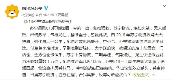 苏宁易购818再燃烽烟,令箭一出,剑指强敌。苏宁物流,疾如火箭,无人能敌。群情激昂,气概龙江,精准至分,誓赢此战。自 2016 年苏宁物流收购天天快递,强化最后一公里,配送时效迅速提升,中心仓、苏宁物流如约送急速半日达。付费尊享准时达,早到晚到皆赔付,力争送的快,确保送的准!前置仓、门店仓、全方位仓储体系。苏宁平房物流,二期再建,气势如虹。龙江快递作业能力承载数量数十万件,配送淮时率几近100%,苏宁818三十周年庆如火如茶,硝烟四起,物流豪杰厉兵秣马, 冲刺的战鼓已经敲响。华山论剑敢立潮头,兵贵神速,当属苏宁物流,胜券在握,舍我其谁,汝等可敢应战否?