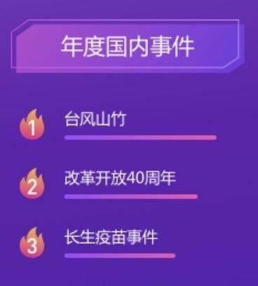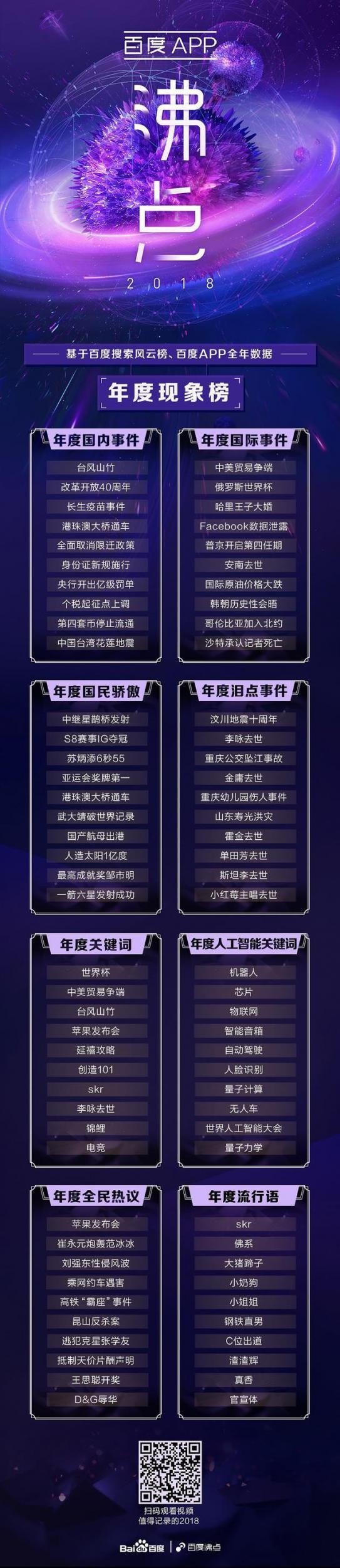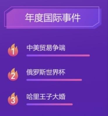 除了以上三个榜单外,2018百度APP沸点搜索子榜单还包括:年度国内事件、年度国际事件、年度全民热议、年度泪点事件、年度人工智能关键词。