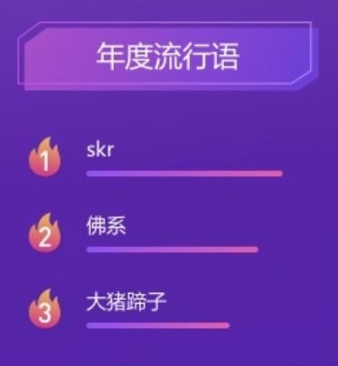 年度流行语:skr、佛系、大猪蹄子、小奶狗、小姐姐、钢铁直男、C位出道、渣渣辉、真香、官宣体。