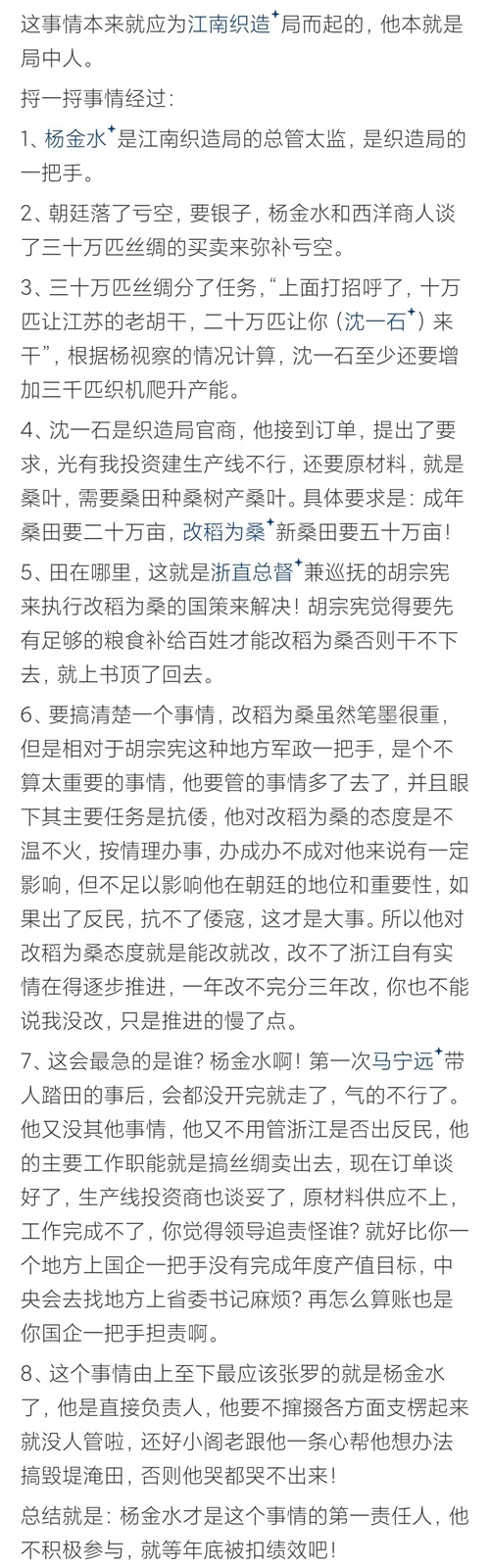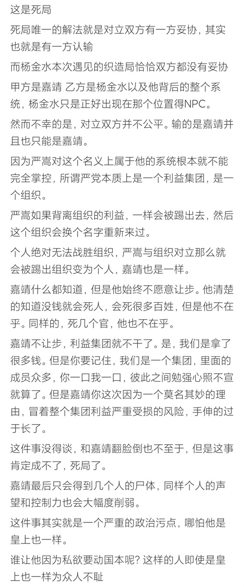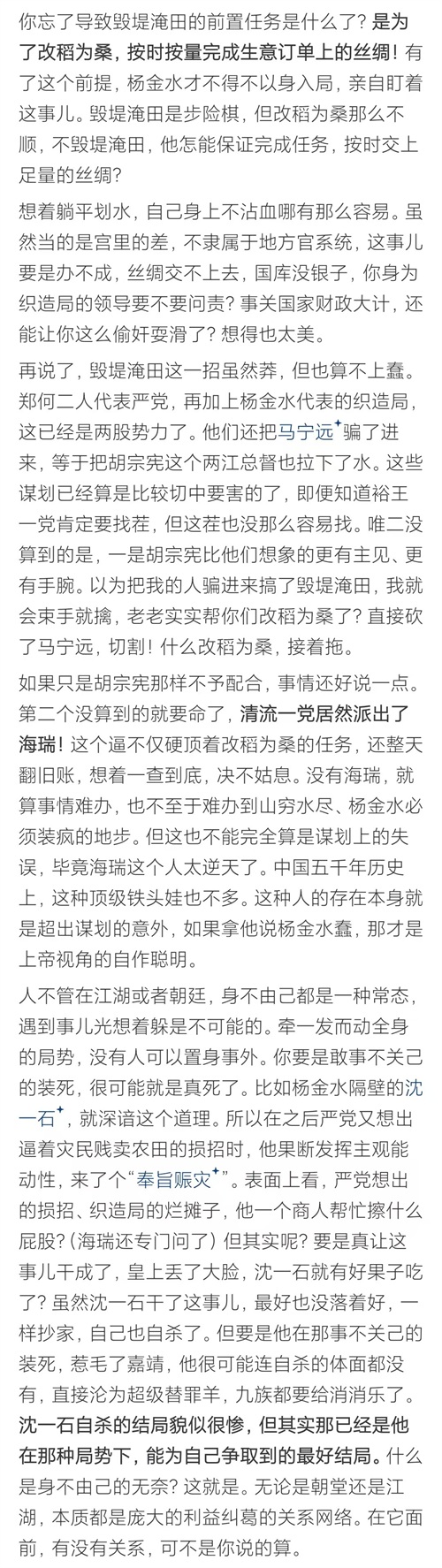这让我想起了历史上类似的事件。比如清朝的张廷玉,他曾因权力斗争受尽屈辱,但也始终无法摆脱体制内的压力。无论他如何做,最终也难逃体制的束缚。杨金水也是如此,尽管他有能力为百姓谋福利,但在朝廷那张错综复杂的权力网里,他只是个微不足道的小人物,最终只得屈服。