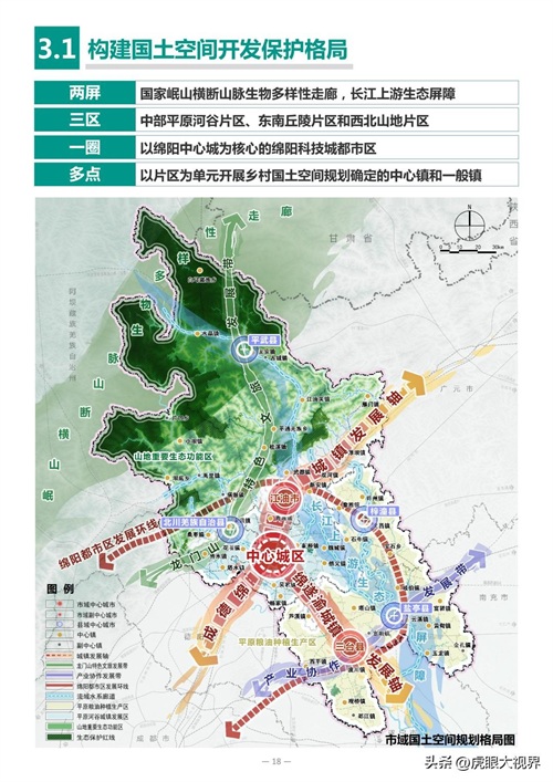 跟一核两翼三区协同的核心思想是一样的。但“绵阳科技城都市区”这个概念正式提出,并锚定了绵阳城市的三个发展方向:绵江广城镇发展轴,绵遂渝城镇发展轴,绵德成城镇发展轴。