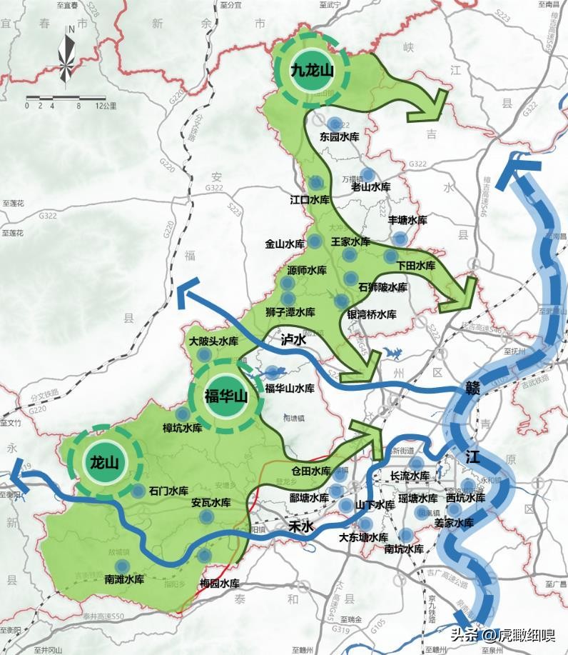 “多廊”指多条生态廊道,包括赣江、禾水和泸水 3 条主要水系生态廊道,以及顺应山地丘陵地形走势构建的四条山体林地生态廊道,形成蓝绿交织的生态廊道网络。