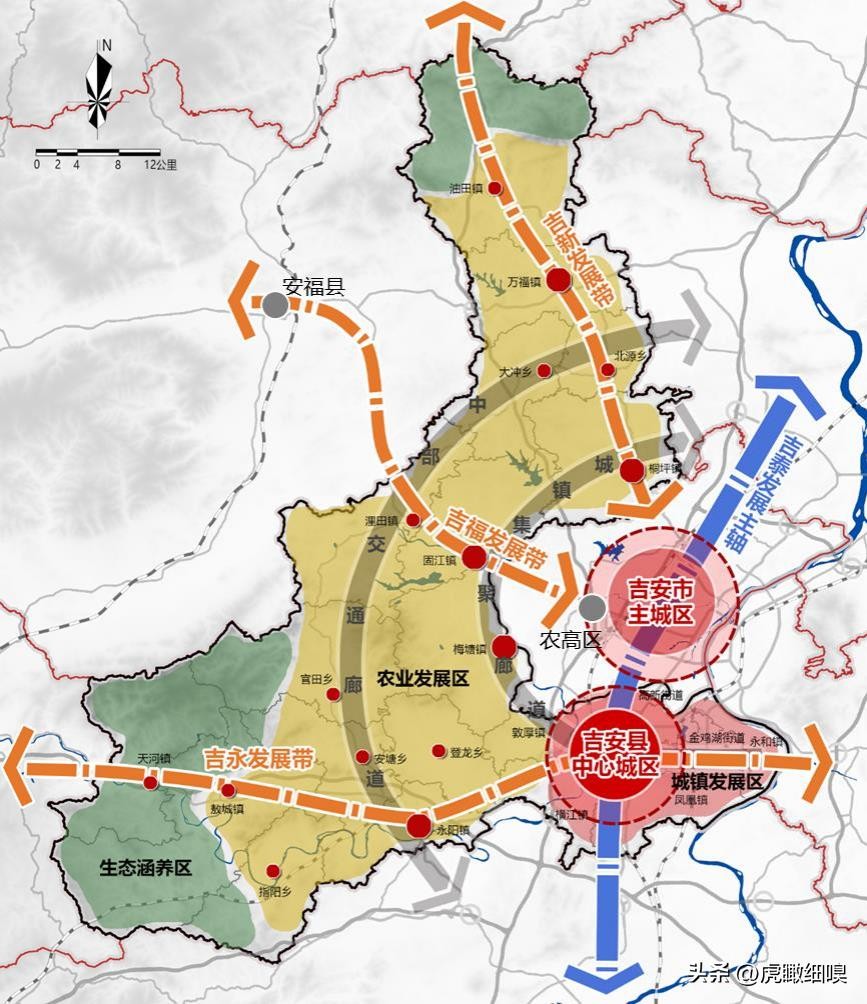 “三带”为依托交通干线构建由吉州区和吉安县城向外放射的三条城镇发展带,包括吉福发展带(吉安-安福)、吉新发展带(吉安-新余)和吉永发展带(吉安-永新),沿线城镇充分发挥内通外联的重要作用强化功能集聚;