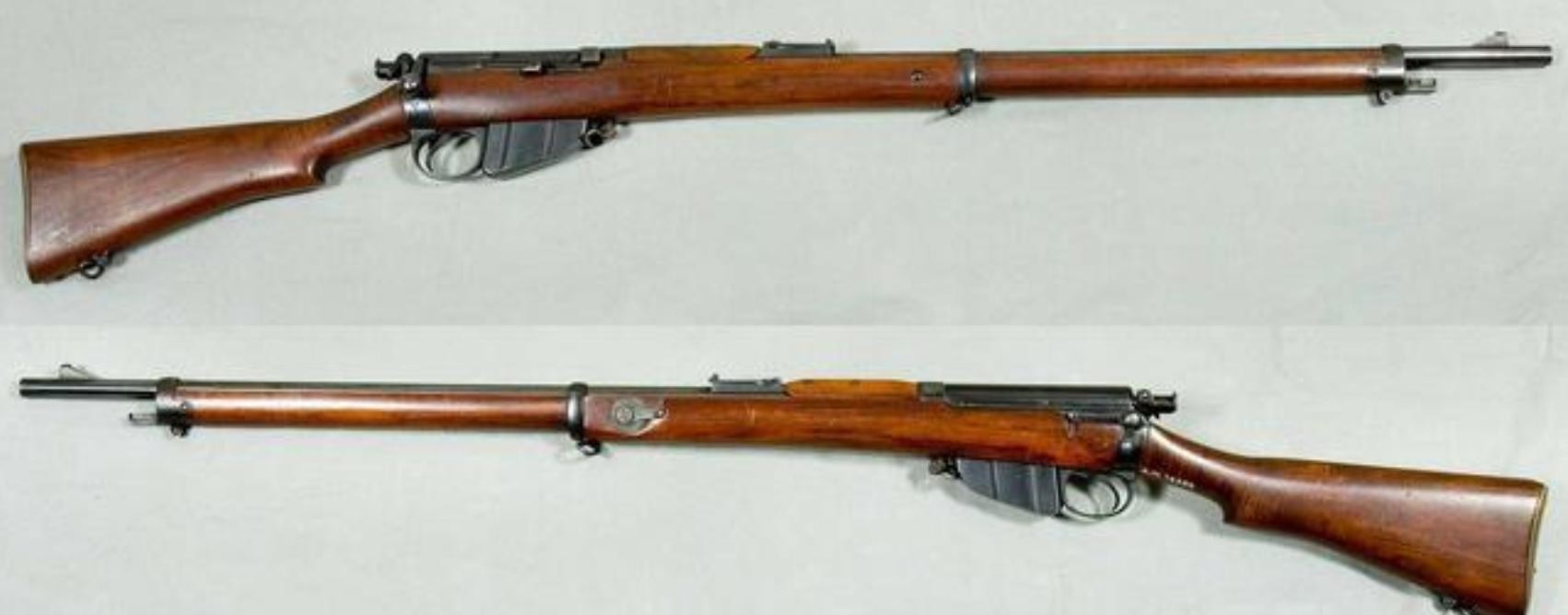 李·恩菲尔德步枪No.1型:第一次世界大战中被英国军队广泛使用。前枪托与枪口齐平是它外形上最显著的特征,1907年定型的MK.III是主要的改进型号。第一次世界大战期间为了满足提高步枪产量的需要,MK.III简化型于1916年投产,一直到第二次世界大战期间仍大量生产、使用,是第二次世界大战前期英军装备的主要步枪。