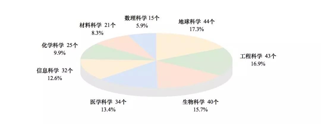 254个国家重点实验室分布在8个学科领域,其中,地球科学领域44个,占实验室总数的17.3%;工程科学领域43个,占实验室总数的16.9%;生物科学领域40个,占实验室总数的15.7%;医学科学领域34个,占实验室总数的13.4%;信息科学领域32个,占实验室总数的12.6%;化学科学领域25个,占实验室总数的9.9%;材料科学领域21个,占实验室总数的8.3%; 数理科学领域15个,占实验室总数的5.9%。
