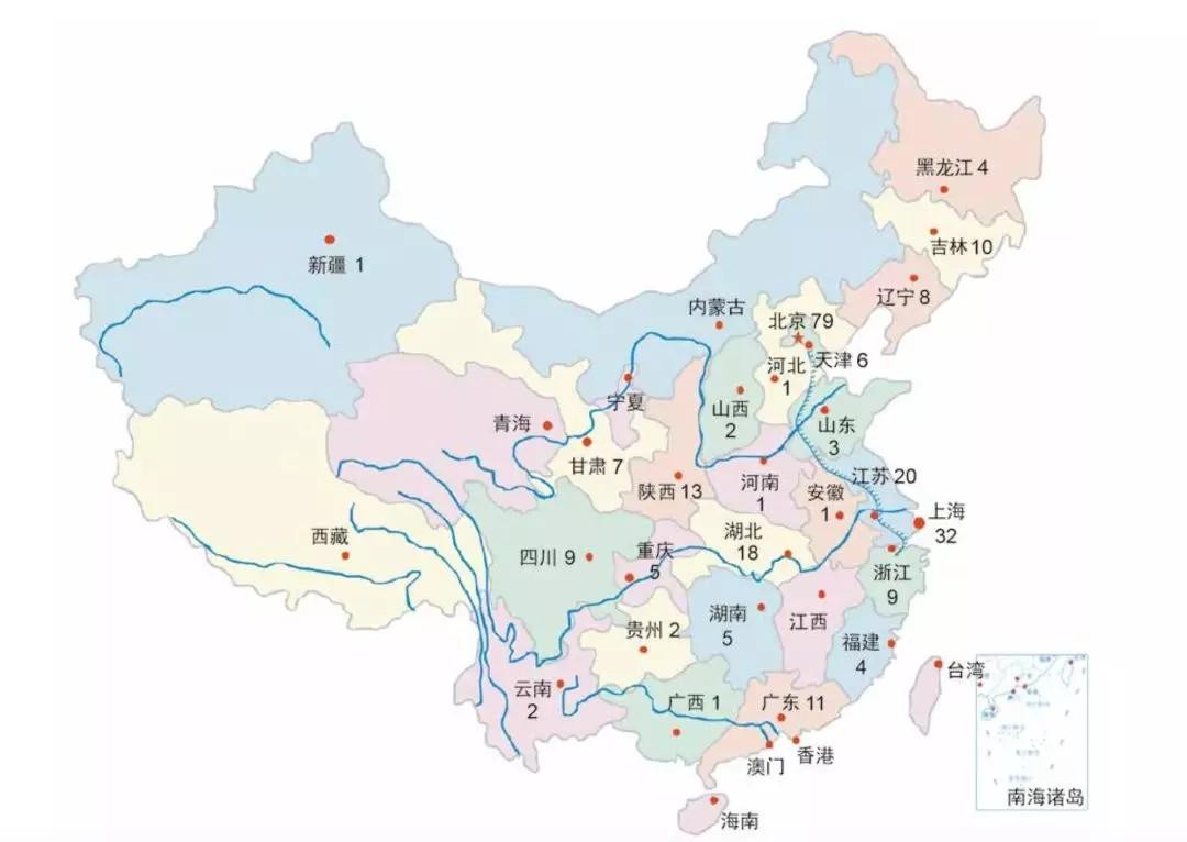 国家重点实验室分布在全国25个省、自治区和直辖市,其中北京市79个,上海市32个,江苏 省20个,湖北省18个,陕西省13个,基本反映了我国基础研究力量的地域分布。