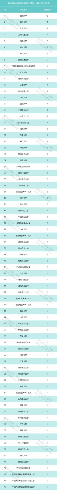下面看看各高校国家重点实验室的数量统计(数据来源于科技部发布的报告;共建的国家重点实验室按各共建单位各有一个进行统计;科技部发布的报告中国家重点实验室不包括省部共建国家重点实验室和企业国家重点实验室;统计数据时未去掉2017年评估未通过的国家重点实验室名单):