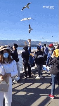 大爷,是喂海鸥,不是喂恐龙啊!