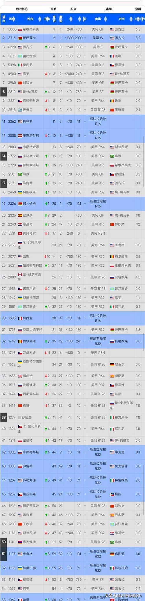 女单方面,萨巴伦卡凭借着美网冠军的积分,排名稳居第二,对世界第一斯瓦泰克构成了巨大的威胁,佩古拉、纳瓦罗等选手,也凭借着出色的表现,排名稳步上升