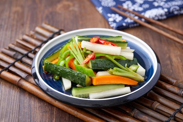 1、白菜帮洗净,切成小块,胡萝卜去皮洗净切成条,黄瓜洗净切成条。将三种食材放入盆中,加入适量盐,搅拌均匀,腌制20分钟。