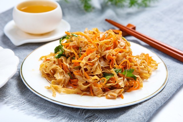 1、豆皮切成丝,锅中烧开水,放入豆皮丝焯水2 - 3分钟,捞出后用凉水冲洗几遍,沥干水分。