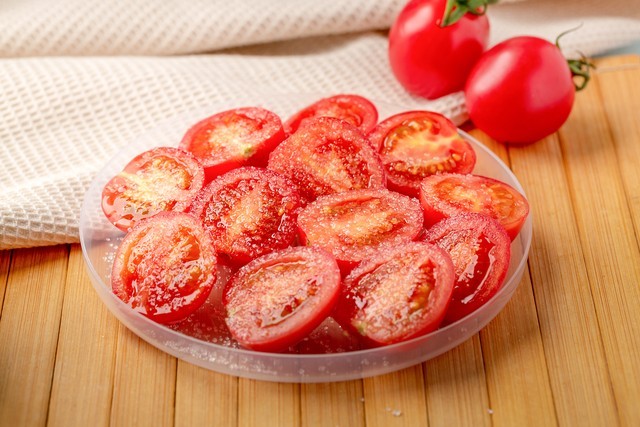 2、将切好的西红柿放入碗中,加入白糖,搅拌均匀,放置10分钟左右,待白糖融化,西红柿出汁即可。