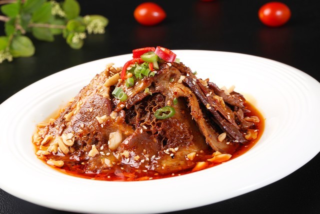 4、将切好的牛肉、牛肚、牛舌放入碗中,倒入调味汁,撒上葱花和香菜段,搅拌均匀即可。