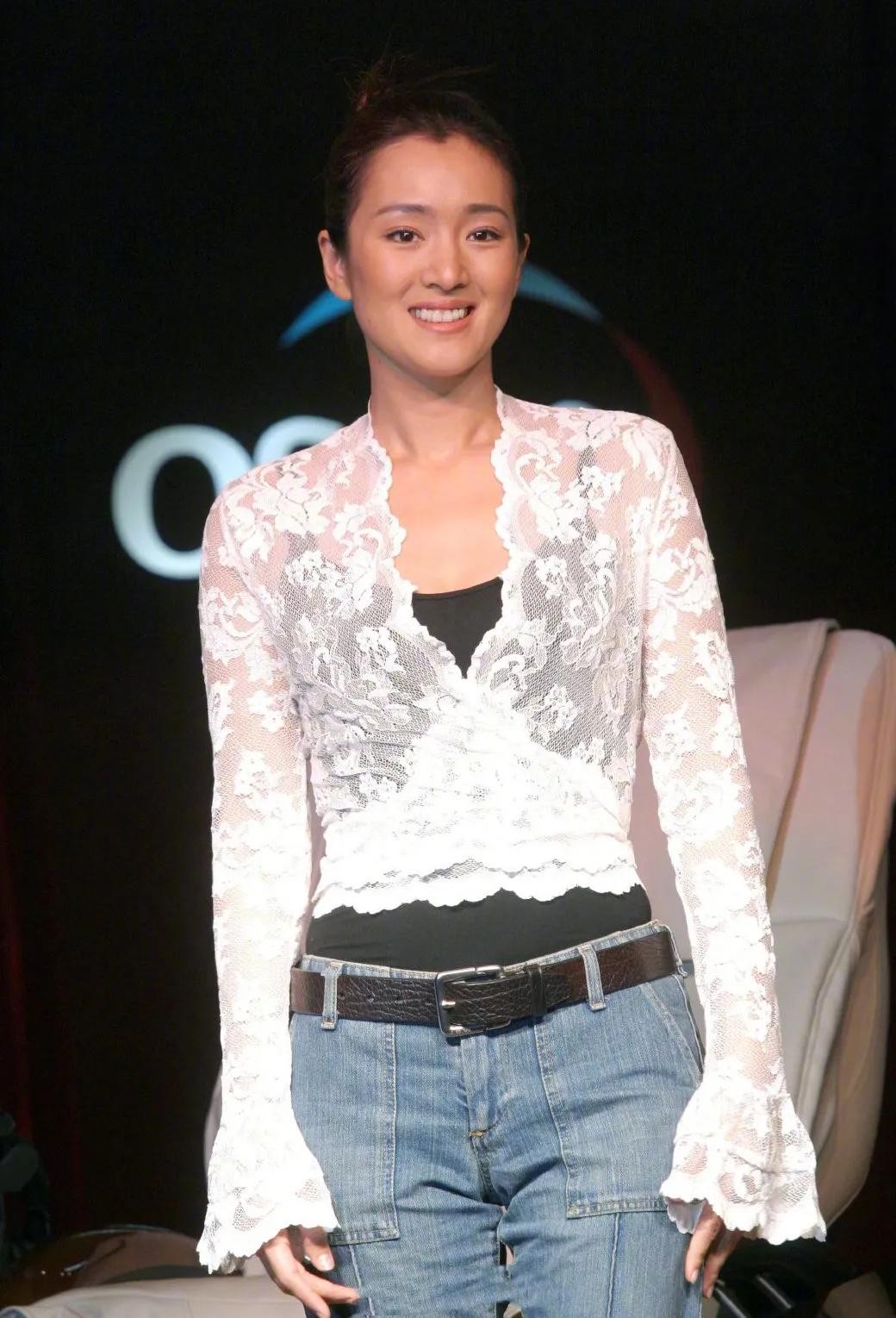 03年的时候蕾丝元素盛行,成熟时髦的女性都会选择穿黑色蕾丝或是白色蕾丝的衣服,尤其是上衣,那简直是性感女人的象征!都很崇拜呢!当时巩俐身穿一件白色蕾丝钩花的上衣,里面穿了一件黑色吊带背心韵味打底,经典的黑白配搭配的妥妥当当不违和。腰间的交叉围裹住小蛮腰,勾勒出现在的蚂蚁腰的效果,荷叶边的袖口更显俏皮可爱气质。